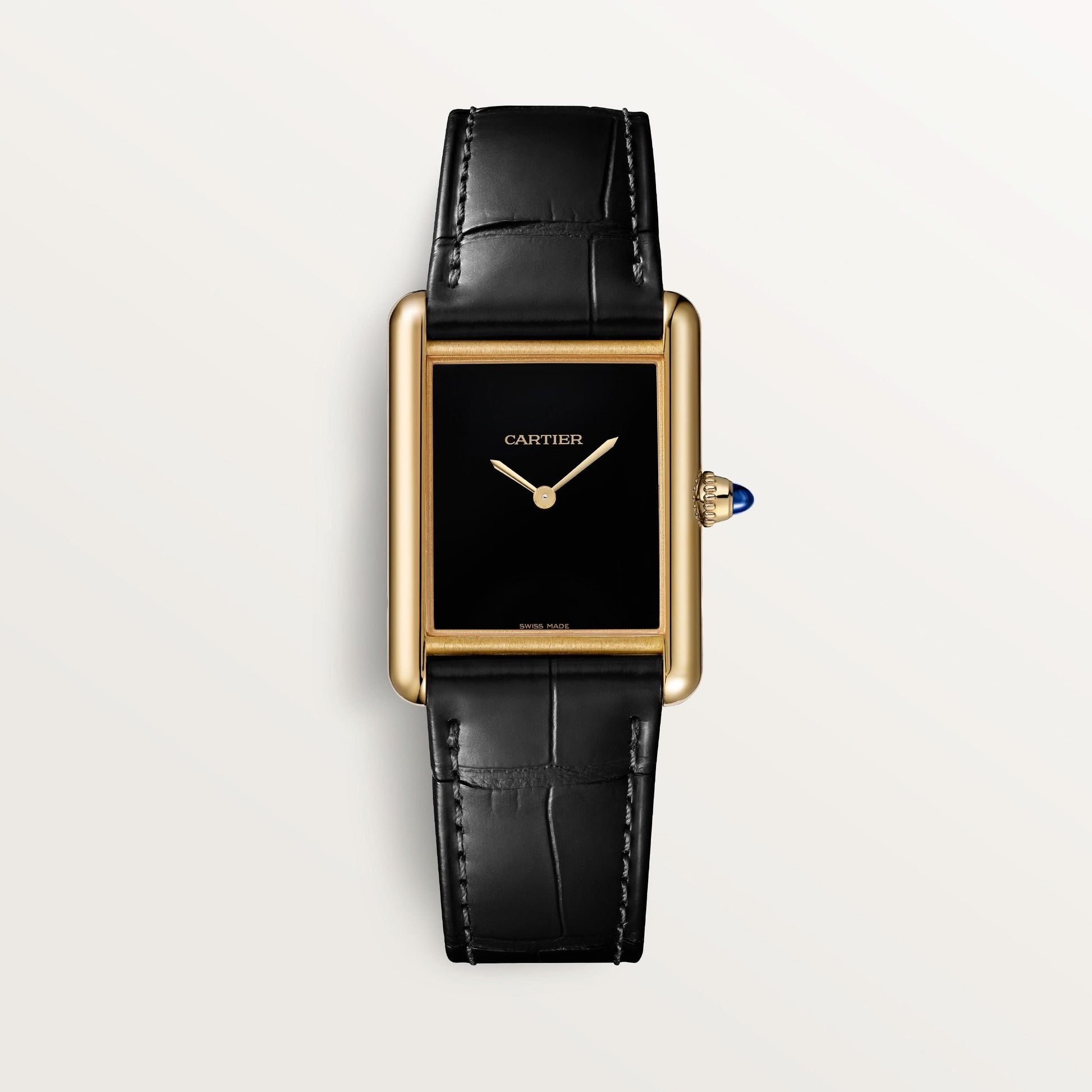 Tank Louis Cartier watch, medium model, Manufacture mechanical movement with manual winding. Case in 18K yellow gold (750/1000), beaded crown set with a sapphire, black lacquer dial, sword-shaped hands in golden-finish steel, mineral crystal, semi-matte black alligator leather strap, ardillon buckle in 18K yellow gold (750/1000). Case dimensions: 1.32”x 1”. Thickness: 0.25”. Water-resistant up to 3 bar (approx. 30 meters/100 feet).