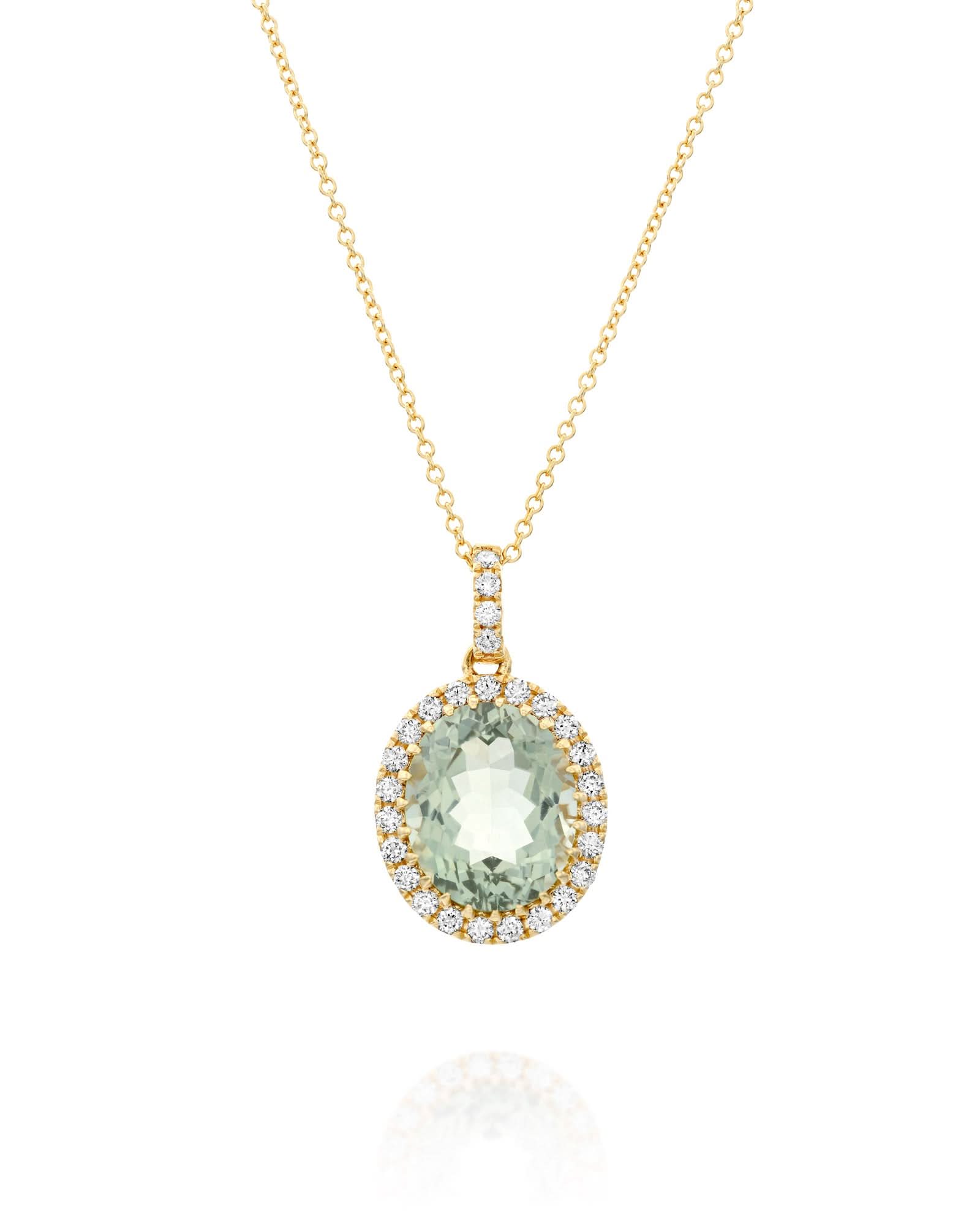 תליון מזהב צהוב 18 קראט משובץ אבן אמטיסט ירוק בחיתוך אובלי. האבן מוקפת בהילת יהלומים בשיבוץ פווה