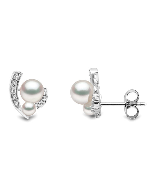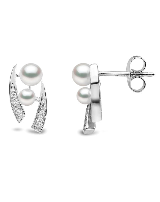 עגילים פנינים ומבנה זהב לבן משובץ יהלומים