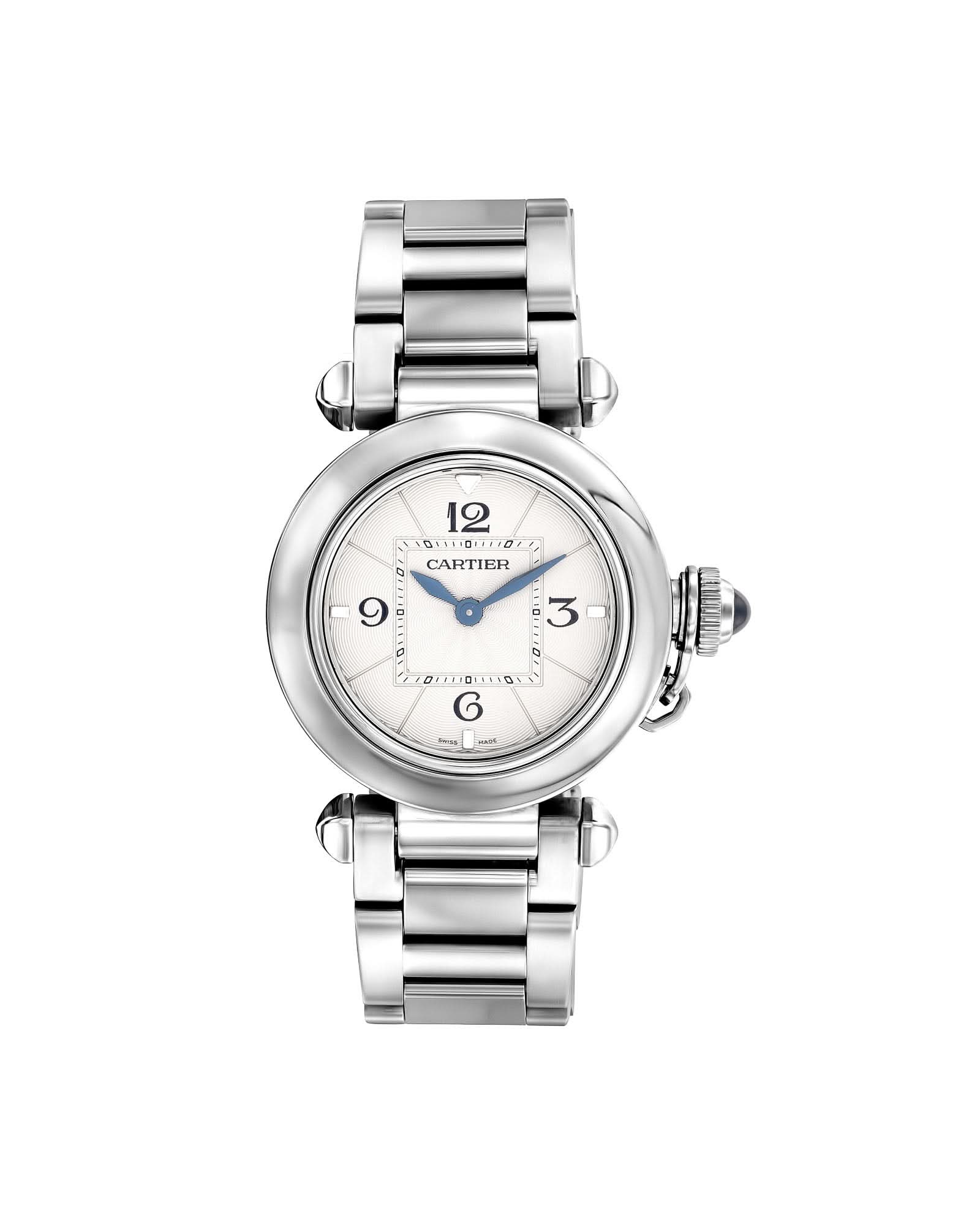 Tank Française watch, small model, quartz movement. Steel case. Faceted crown in steel decorated with a synthetic cabochon-shaped spinel. Silvered sunray dial, blued-steel sword-shaped hands, sapphire crystal. Steel bracelet. Case dimensions: 25.7 mm x 21.2 mm, thickness: 6.8 mm. Water-resistant to 3 bar (approx. 30 meters).