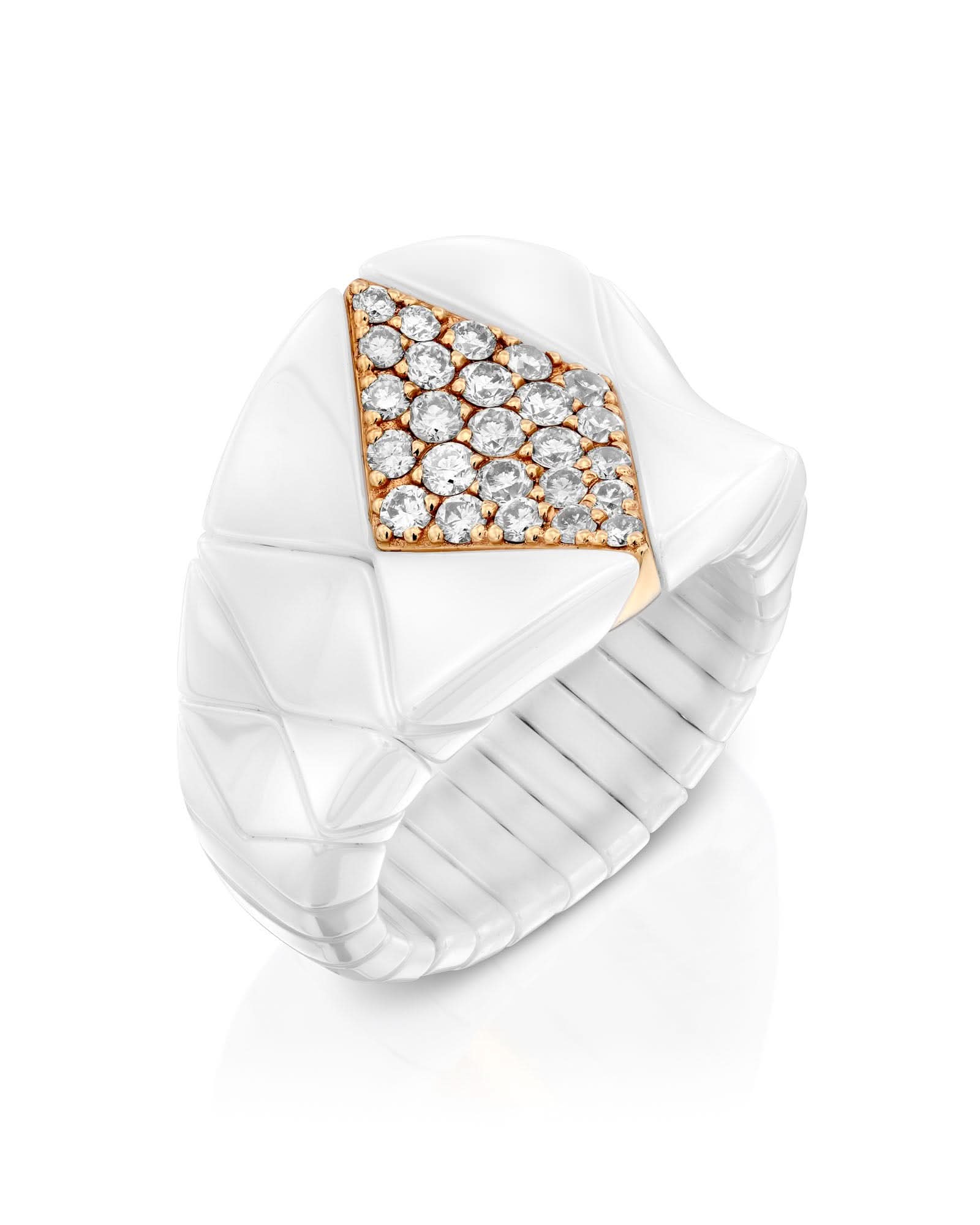 Geometric-design ring crafted from white ceramic, featuring a central 18k rose gold element set with diamonds in pavé setting.