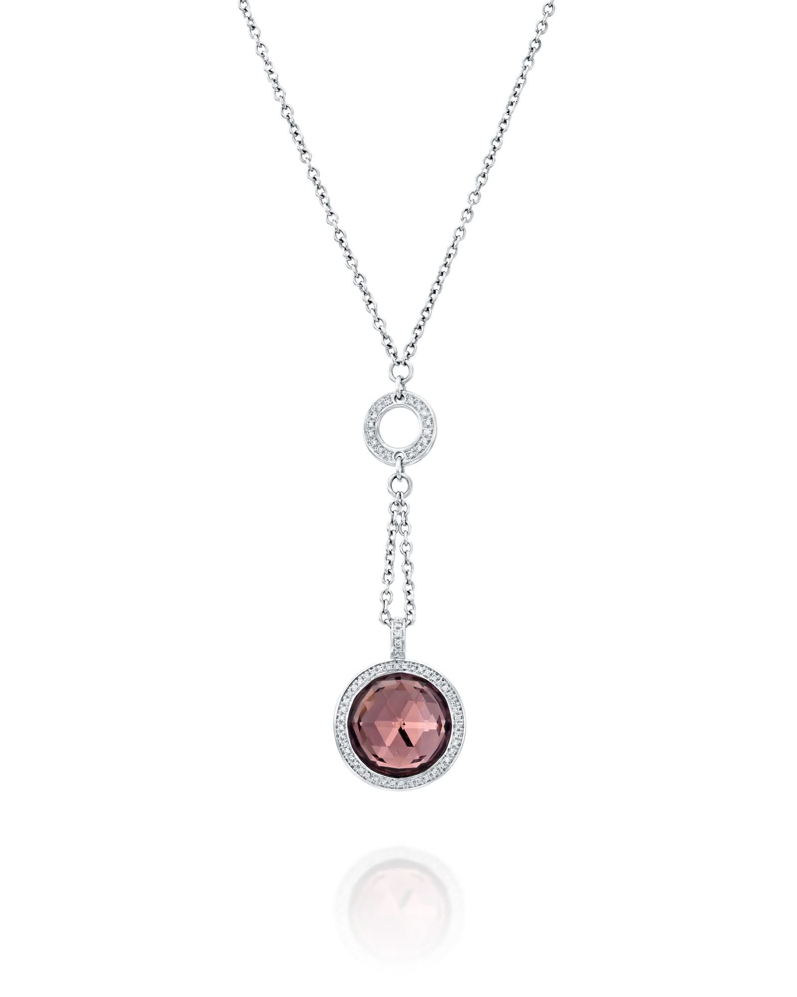 Necklace crafted in 18k white gold, set with a central round-cut pink amethyst. The stone is surrounded by diamonds.