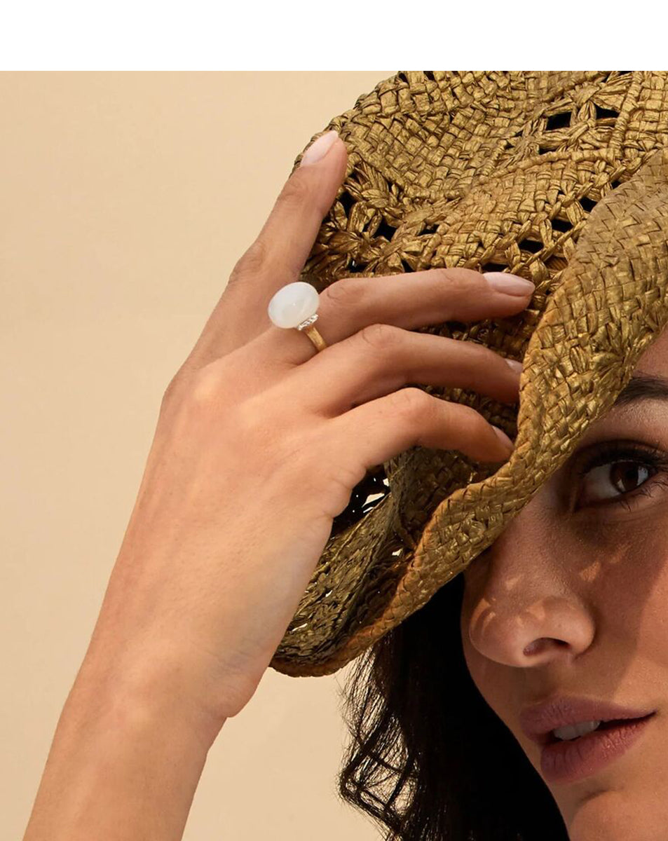 Nanis ring in yellow gold, set with a big moonstone in the center and diamonds on the sides.