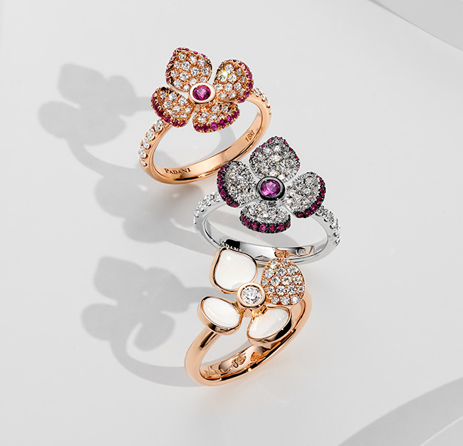 אז מה בקולקציה ובהפקה? הקו העיצובי היוקרתי של פדני חוגג את העדינות והנשיות! קולקציית VIOLETTO (בהשראת פרח הסיגלית) האהובה של החברה, לצד קולקציית VIOLETTO SHINE החדשה, המסמלת פריחה, שמחה, שגשוג והתחלות חדשות - במנעד של זהב לבן/צהוב/ורוד, אבנים יקרות צבעוניות ויהלומים.